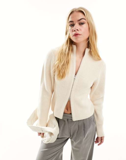 Cárdigan blanco con mangas abombadas y cremallera delantera de mezcla de algodón y lana de merino de & Other Stories