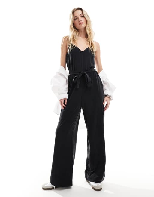 Mono largo negro elástico de pernera holgada con tirantes finos y lazada en la cintura de & Other Stories