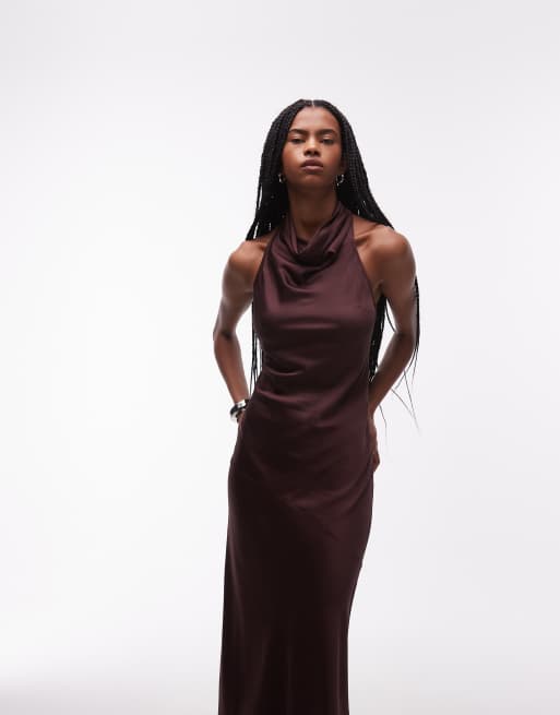 Vestido largo marrón chocolate con cuello halter de satén de & Other Stories