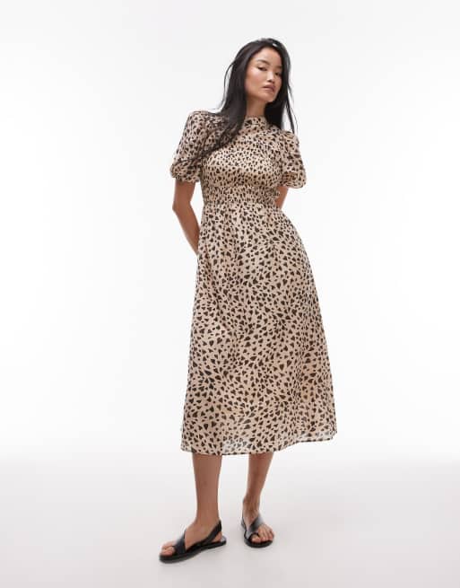 Vestido midi beis con estampado de corazones negros, cuerpo fruncido y mangas abullonadas de & Other Stories