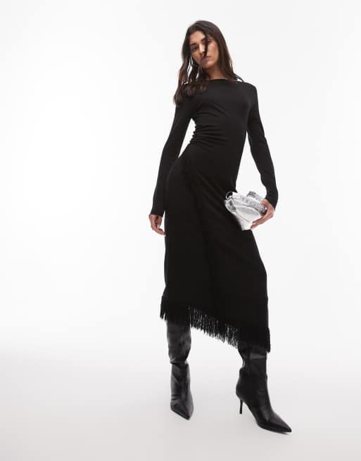 Vestido semilargo negro con diseño cruzado de flecos y bajo asimétrico de & Other Stories