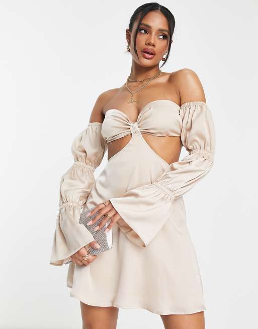 Vestido corto beis de corte skater con aberturas de satén de Parallel Lines