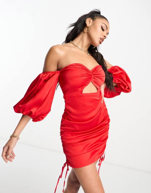 Vestido corto rojo con escote Bardot y abertura de satén de Parisian