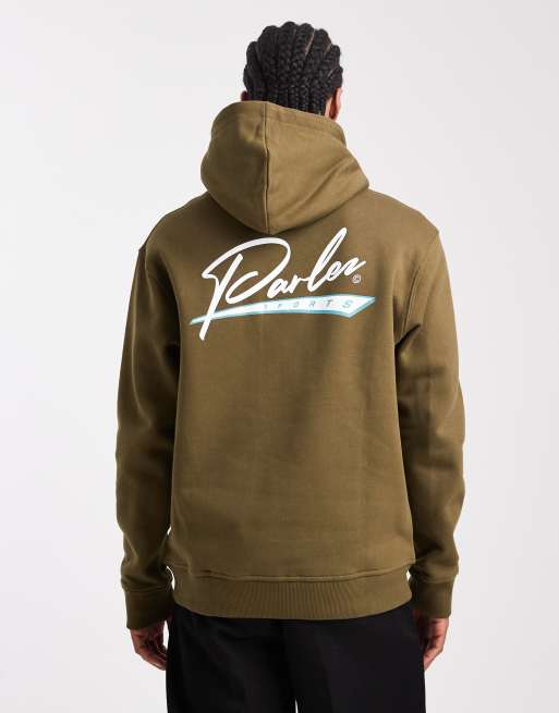 Sudadera caqui con capucha, estampado trasero y logo gráfico deportivo serigrafiado de Parlez