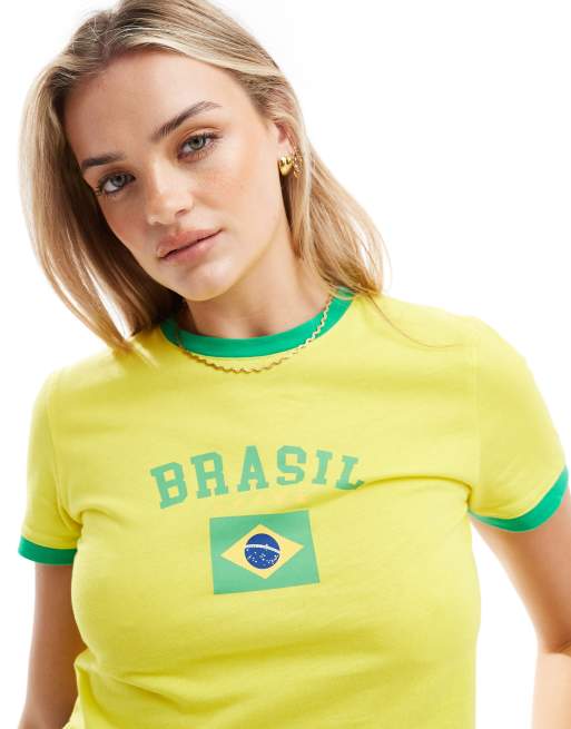 Camiseta amarilla con diseño encogido y estampado gráfico "Brasil" estilo fútbol de PIECES