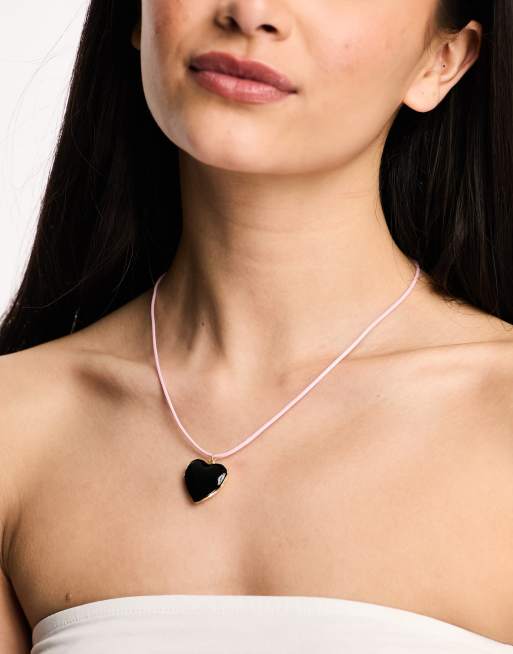 Collar de cuerda rosa con medallón negro de corazón de Pieces
