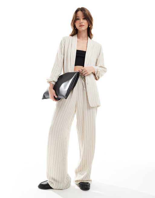 Conjunto a rayas negras y color crema de americana con mangas fruncidas de tejido efecto lino de Pieces