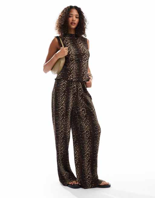 Conjunto de pantalones de pernera ancha y top sin mangas con cuello alto y estampado de leopardo de tejido plisado de Pieces