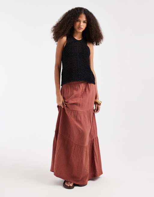 Falda larga marrón caoba oscuro escalonada de estilo boho de Pieces