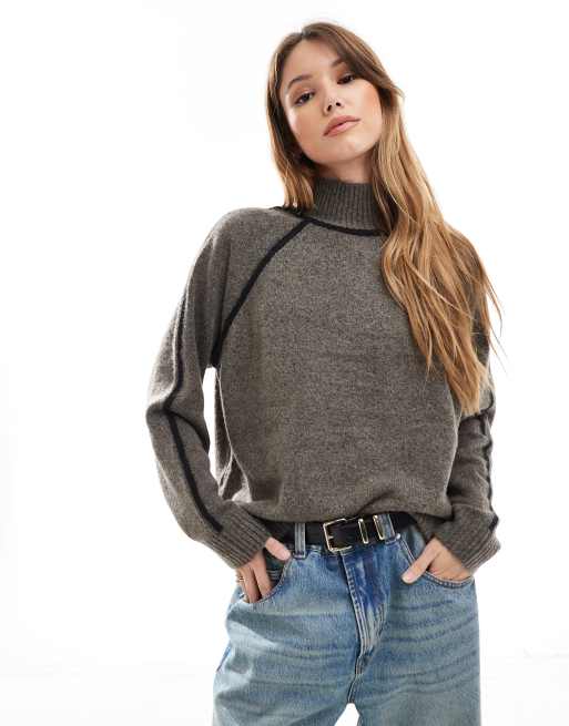 Jersey marrón con cuello alto y detalle de costuras en contraste de PIECES