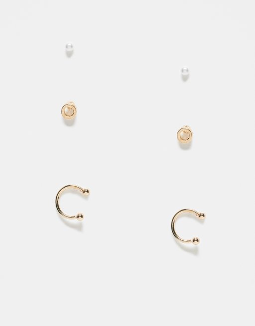 Pack de 3 pendientes de botón y ear cuff dorados con perlas de imitación de PIECES
