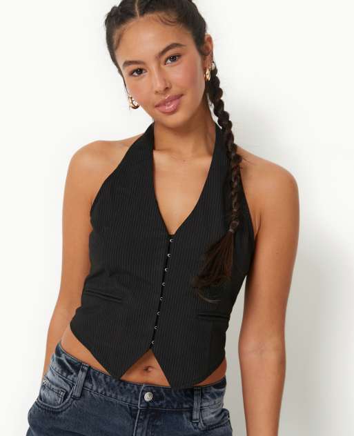 Chaleco de traje de sastre negro a rayas con cuello halter y detalle de corchetes de Pimkie