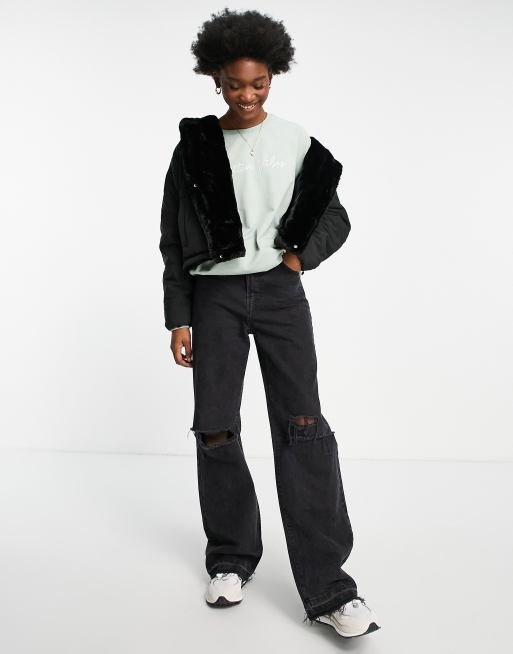 Chaqueta bomber negra con capucha y diseño reversible de borreguito y nailon de Pimkie