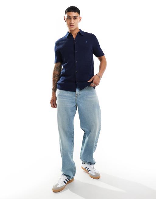 Camisa azul marino abotonada de manga corta con logo de icono de punto de mezcla de algodón de Polo Ralph Lauren