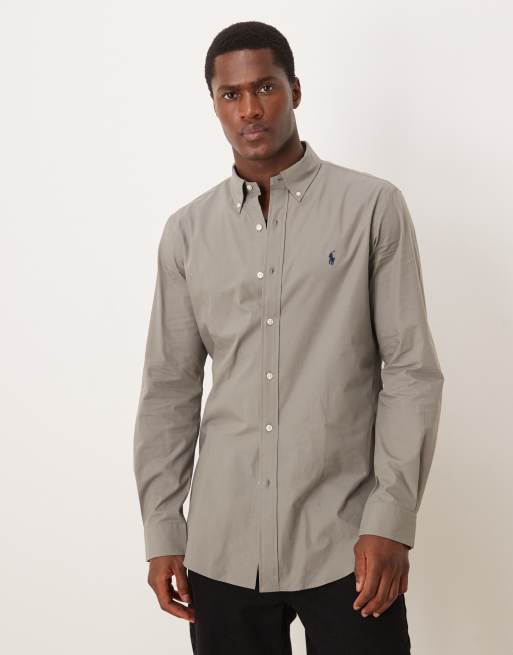 Camisa gris de corte custom con logo de icono de popelina elástica de Polo Ralph Lauren