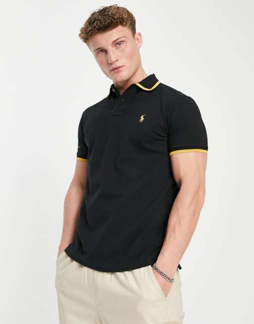 Polo negro de corte personalizado con ribetes y logo dorado de Polo Ralph Lauren