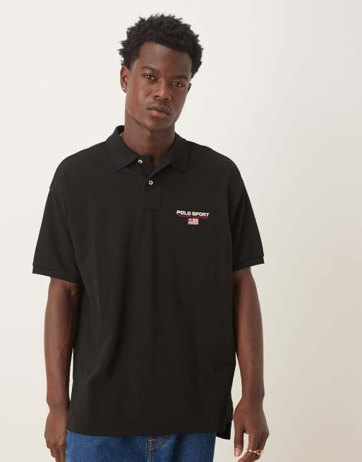 Polo negro extragrande con logo de bandera de piqué de la colección cápsula Sport de Polo Ralph Lauren