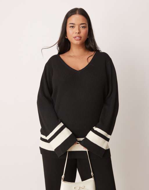 Jersey negro con cuello de pico en contraste de punto de Pretty Lavish Curve (parte de un conjunto)