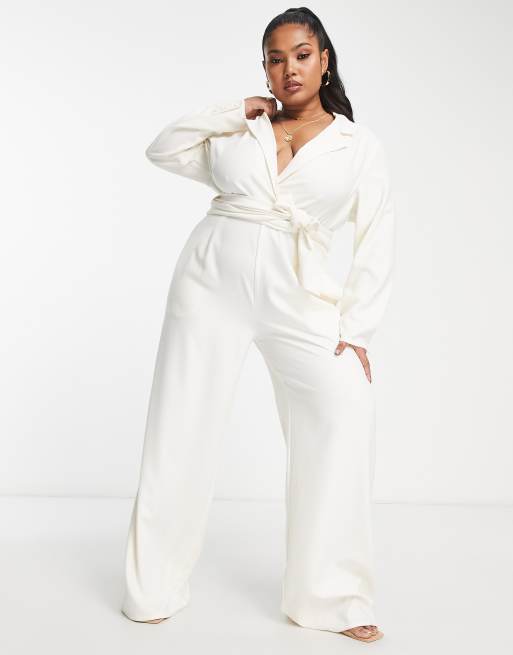 Mono largo color crema de sastre con lazada en la cintura de Pretty Lavish Curve
