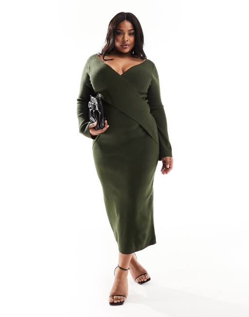Vestido largo verde oliva con diseño cruzado de punto de Pretty Lavish Curve