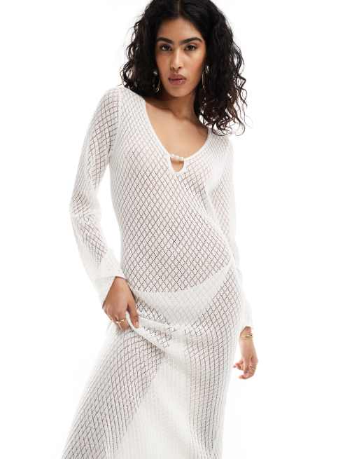 Vestido largo blanco marfil de punto de croché calado para fiesta de despedida de soltera de Pretty Lavish