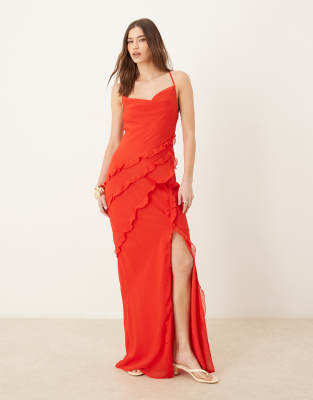 Vestido largo rojo luminoso con volantes asimétricos de tejido texturizado de Pretty Lavish