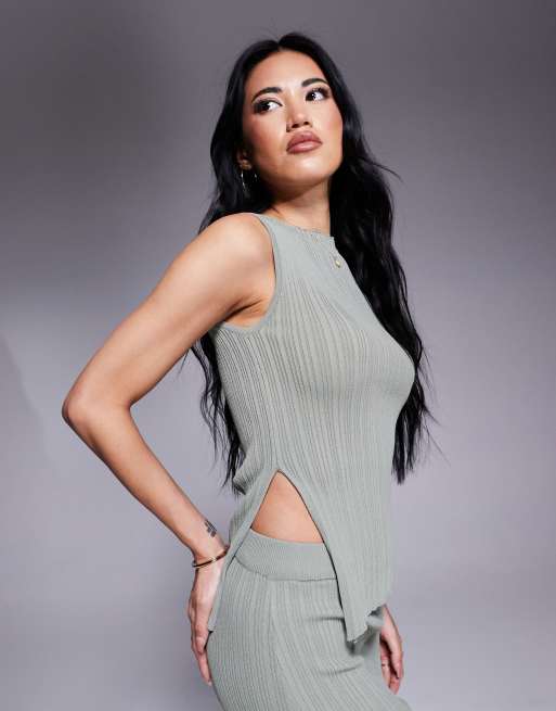 Conjunto caqui de falda larga y top asimétrico sin mangas de canalé de Princess Polly
