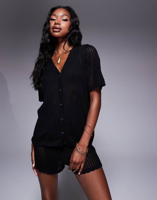 Conjunto negro de pantalones cortos y camisa abotonada con ribete festoneado de croché de Princess Polly