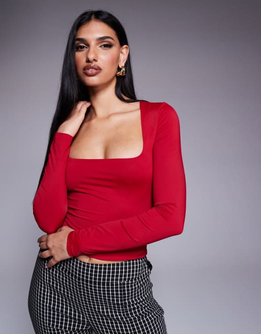 Top corto rojo ceñido de manga larga con escote cuadrado y diseño de doble capa de Princess Polly