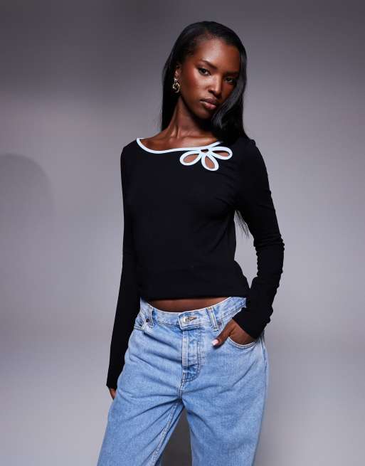Top negro de manga larga con detalle floral calado Double Back de Princess Polly