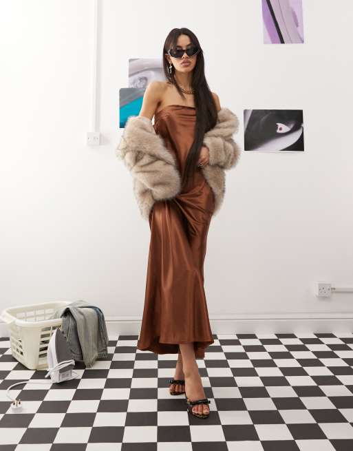 Vestido largo marrón con escote palabra de honor y espalda desbocada con lazada de satén de Princess Polly