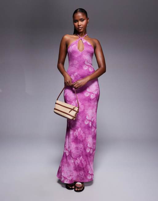 Vestido largo morado de cuello halter con espalda al aire, detalle de abertura y estampado de mariposas Nathaleia de Princess Polly