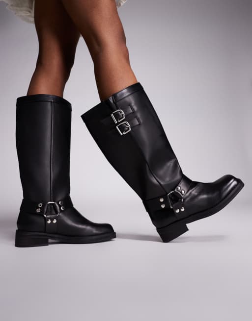 Botas por la rodilla negras planas con detalle de arnés Sirius de Public Desire Wide Fit