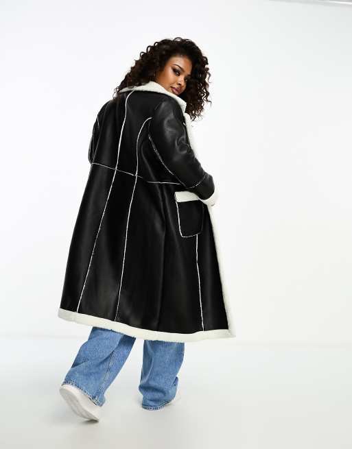 Abrigo de aviador largo negro de cuero sintético con ribetes de borreguito de QED London Plus