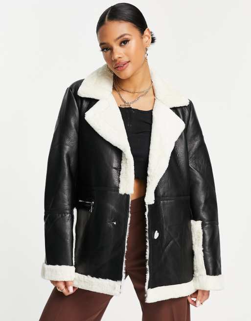 Chaqueta de aviador larga negra revestida con borreguito en contraste de QED London