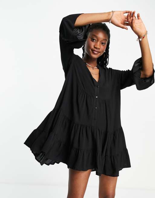 Vestido negro amplio con diseño escalonado y botones de QED London