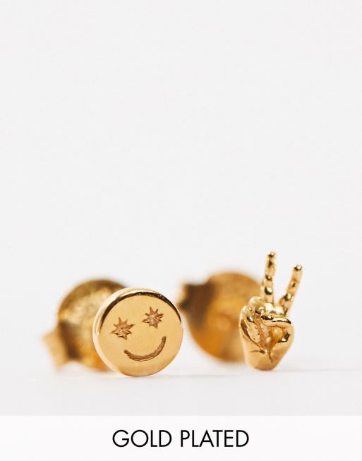 Pendientes de botón con diseño de cara sonriente y símbolo de la paz chapados en oro de 22 quilates con caja de regalo de Rachel Jackson