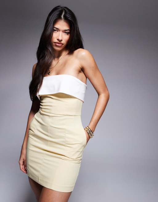 Vestido de sastre corto amarillo crema con escote palabra de honor plegado en contraste de Rare London