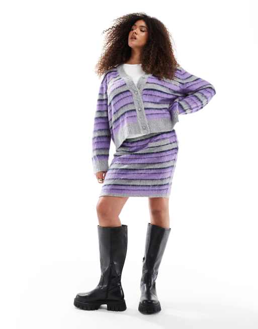 Conjunto morado a rayas de minifalda y cárdigan con botones de strass en forma de estrella de punto exclusivo de Renée Studio
