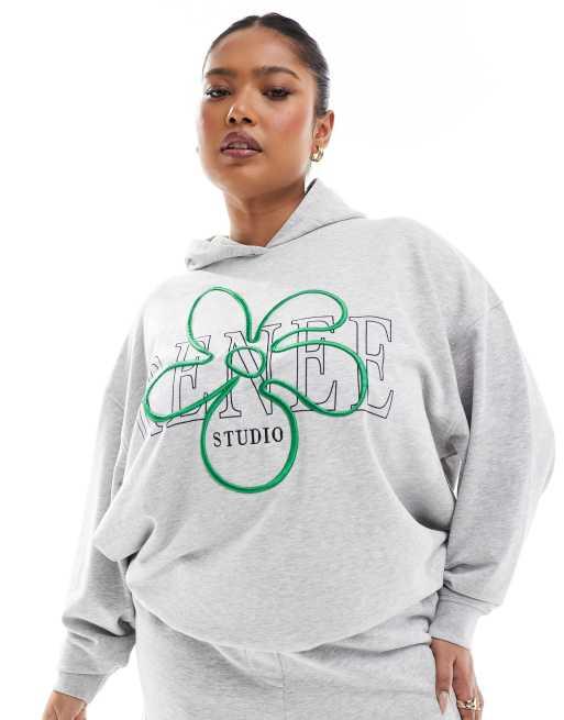 Sudadera gris extragrande con capucha, logo y flor bordada exclusiva de Renee Studio Plus (parte de un conjunto)