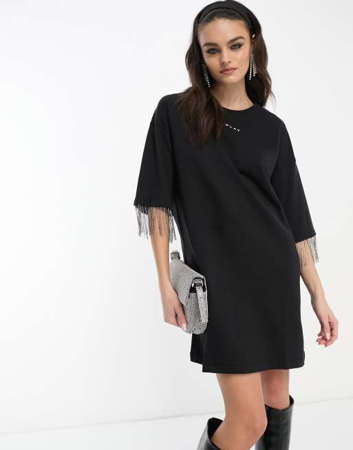Vestido negro estilo camiseta con flecos adornado en las mangas y logo de Replay