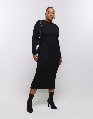 Vestido midi negro de corte recto de tejido texturizado de River Island Plus