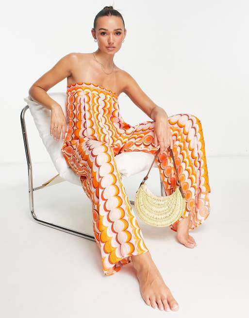 Mono largo naranja con estampado de estilo años 70, escote palabra de honor y lazada en la espalda de River Island