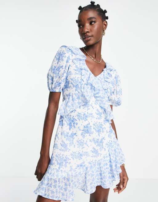 Vestido azul corto asimétrico con estampado de flores y volantes de River Island