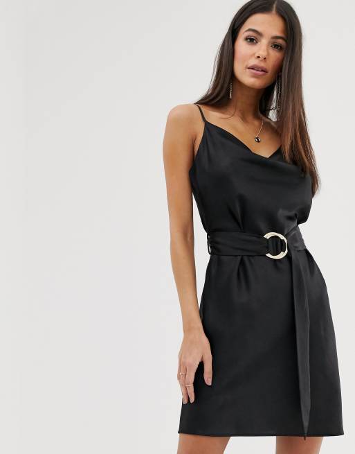 Vestido con tirantes y cuello desbocado con detalle de cinturón en negro de River Island