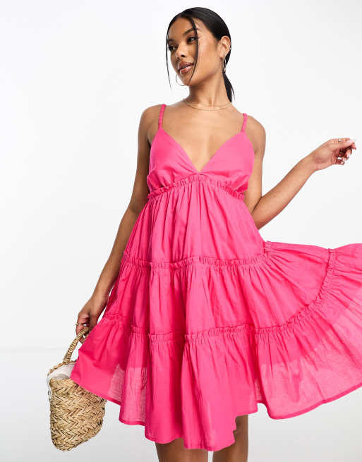 Vestido corto rosa luminoso de corte amplio escalonado con lazada en la espalda de River Island