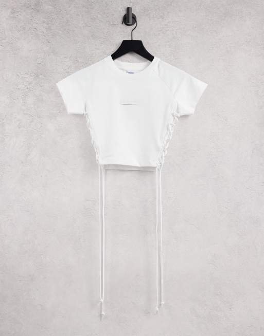 Camiseta blanca con cordones en los laterales y logo de Russell Athletic