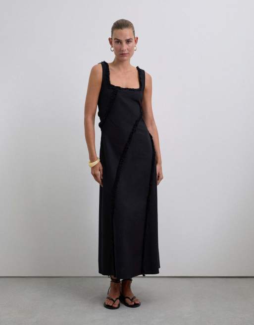 Vestido negro con flecos y pespuntes de Scalpers