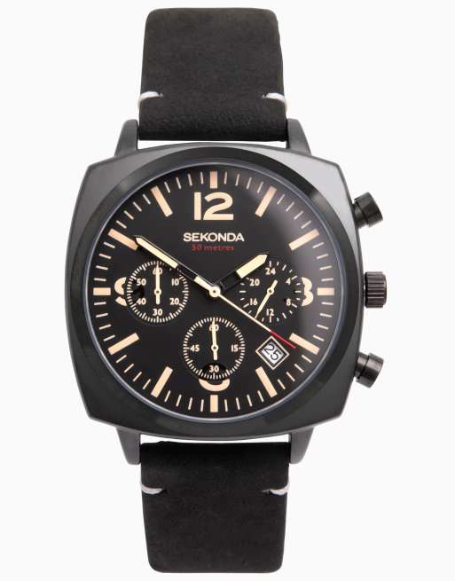 Reloj negro para hombre con cronómetro, caja cuadrada de 40 mm de aleación y correa de cuero Airborne de Sekonda