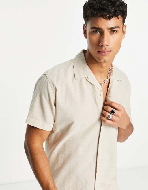 Camisa beis de manga corta con cuello de solapas de mezcla de lino de Selected Homme